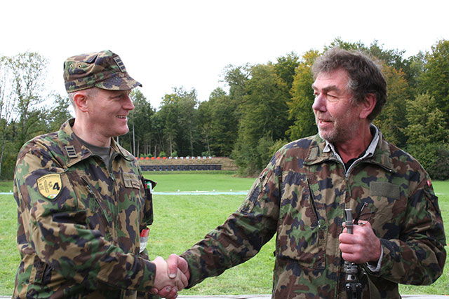 Erfreulich war auch der zahlreiche Besuch unsere Gäste die reges Interesse an userem traditionellen Schiesswettkampf zeigten. Etwa alle 10 Jahre ist uns das Wetter nicht ganz hold aber es war am Samstag nicht ganz so schlimm und der Sonntag war bewölkt aber trocken. Auch die Nebelschwaden verzogen sich püntklich zum Schiessbeginn. Somit war alles gerichtet für einen erfolgreichen Abschluss von Heinz Nater in der Schwaderlohkommission dies nach 25 Jahren als Schützenmeister und 10 Jahre als Präsident. Die Festrednerin Cornelia Komposch bedankte sich ebenfalls für das tolle Engagement von Heinz für das Schwaderlohschiessen. Heinz wurde mit grossem Applaus zum Ehrenmitglied ernannt. Als Dank und Erinnerung erhielt er die Wappenscheibe und ein Bild mit Bundesrat Ueli Maurer einer der efolgreichen Beziehungen von Heinz.